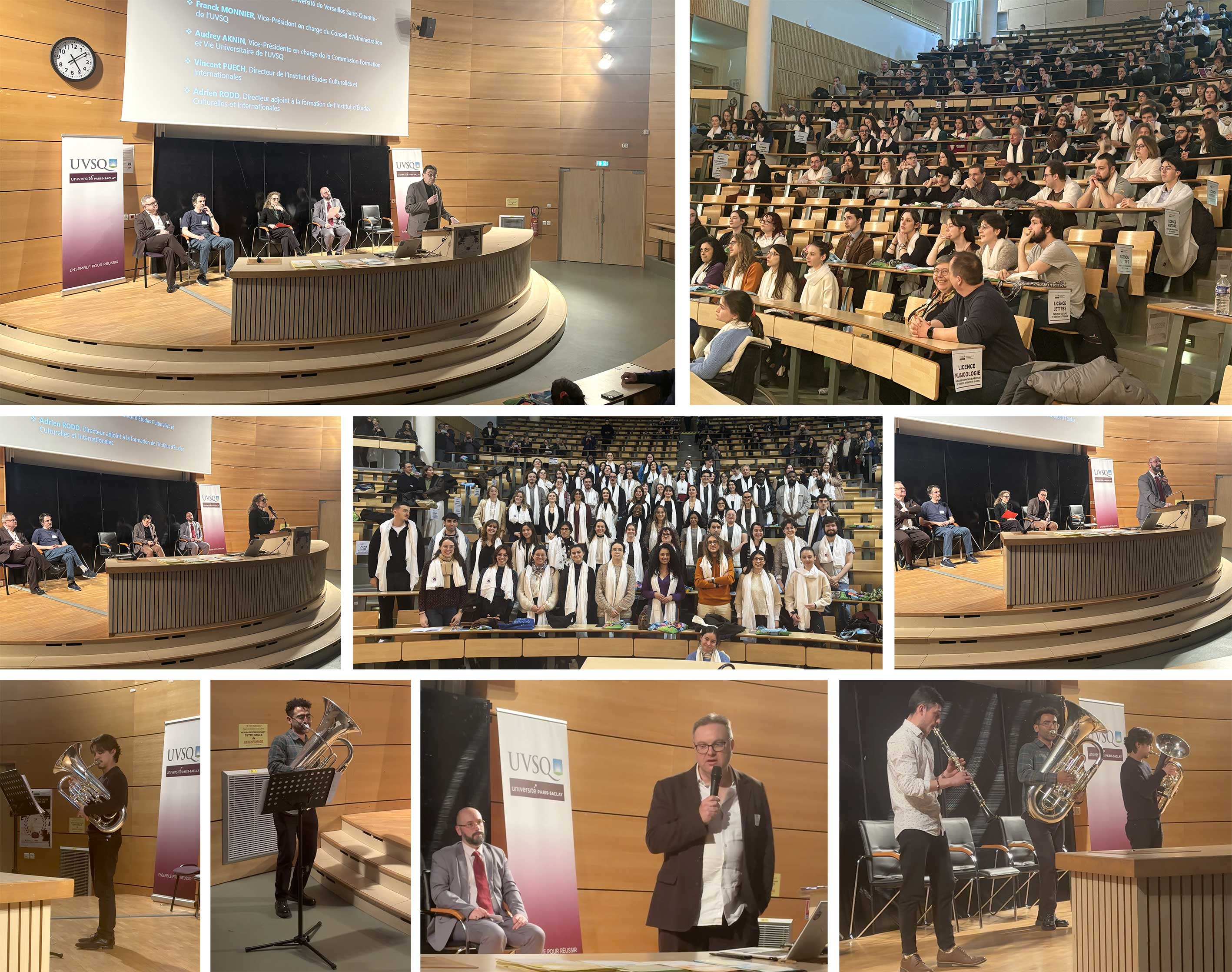 Vincent Puech, maître de cérémonie et directeur de la composante, a conduit cet événement empreint d’émotion et réunissant étudiant.es, familles, enseignant.es et membres de la communauté UVSQ, dans un moment de partage et de célébration.La présidence de l’UVSQ nous a honorés de sa présence lors de cette soirée.