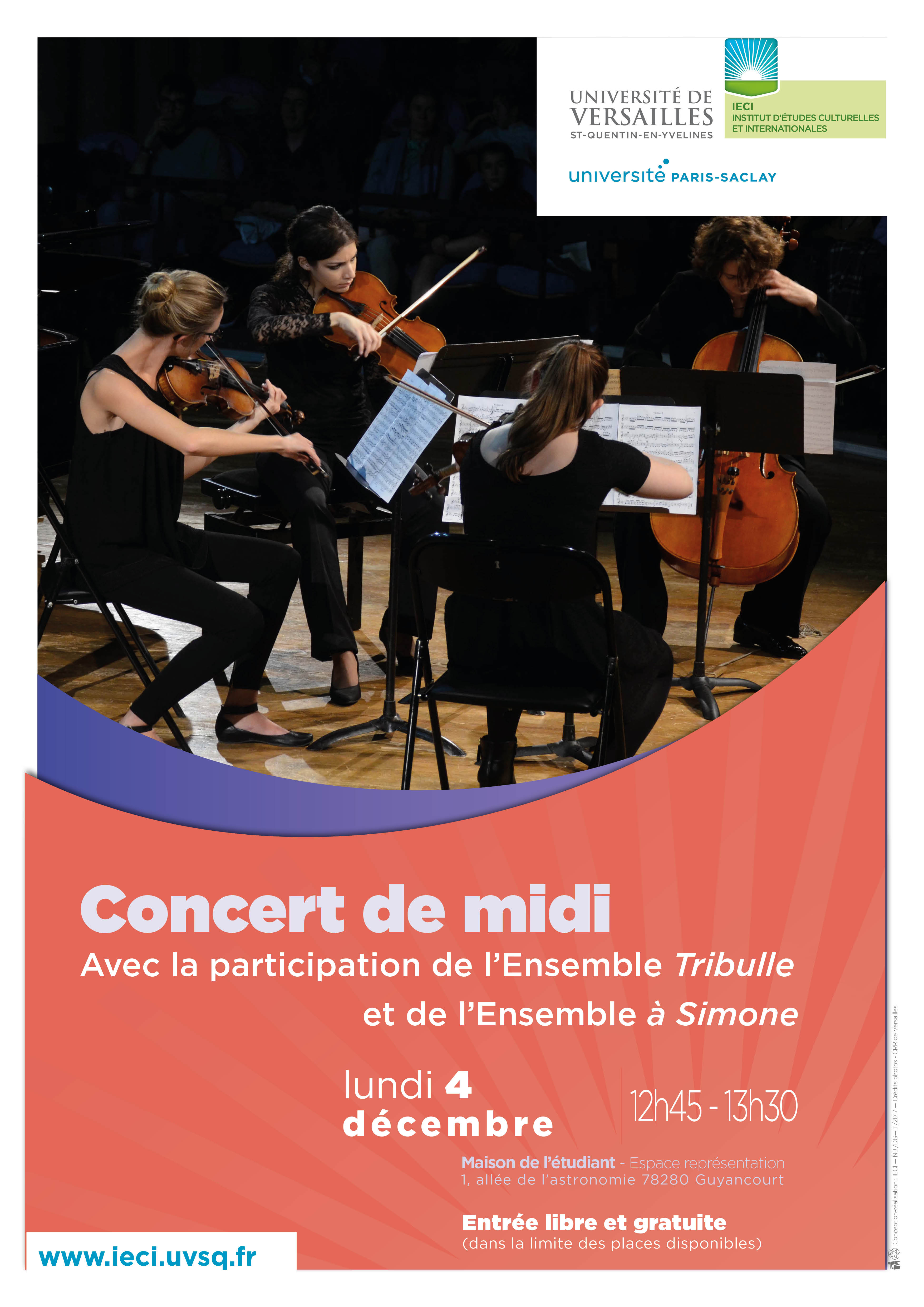 L'ensemble Tribulle et le Quartet à Simone donneront un concert à la Maison de l'étudiant le lundi 4 decembre 2017, de 12h45. Entrée libre et gratuite.
